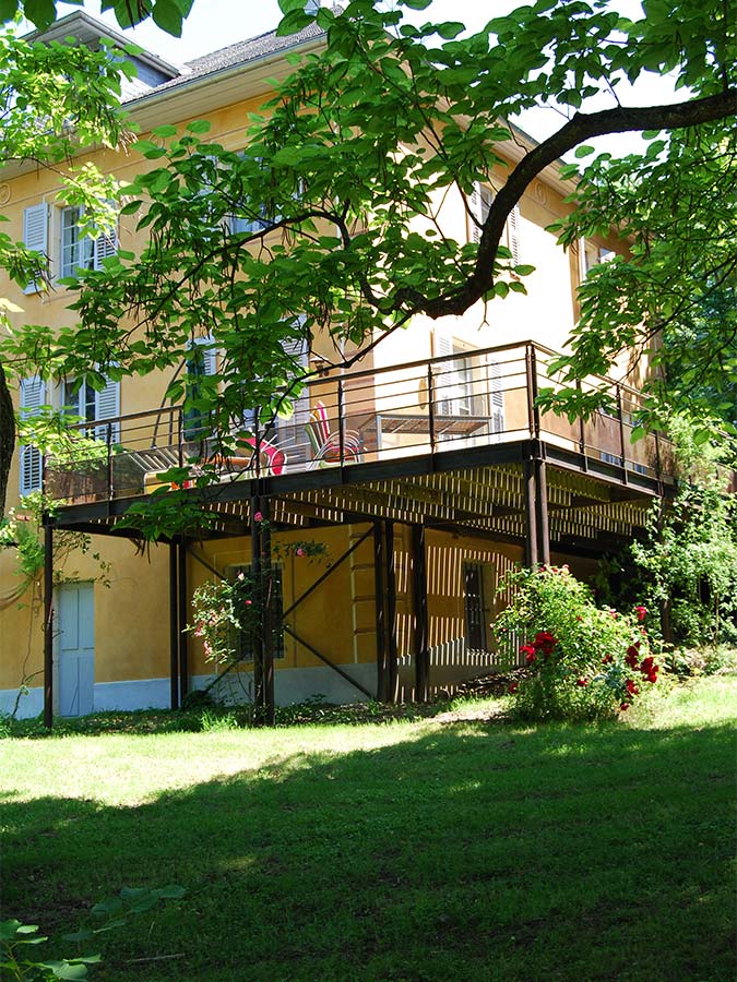 C’est une belle maison savoyarde en pierres, anciens décor sur les murs, et toit en ardoises. En 2002, une grande terrasse donnant sur le jardin a été construite.